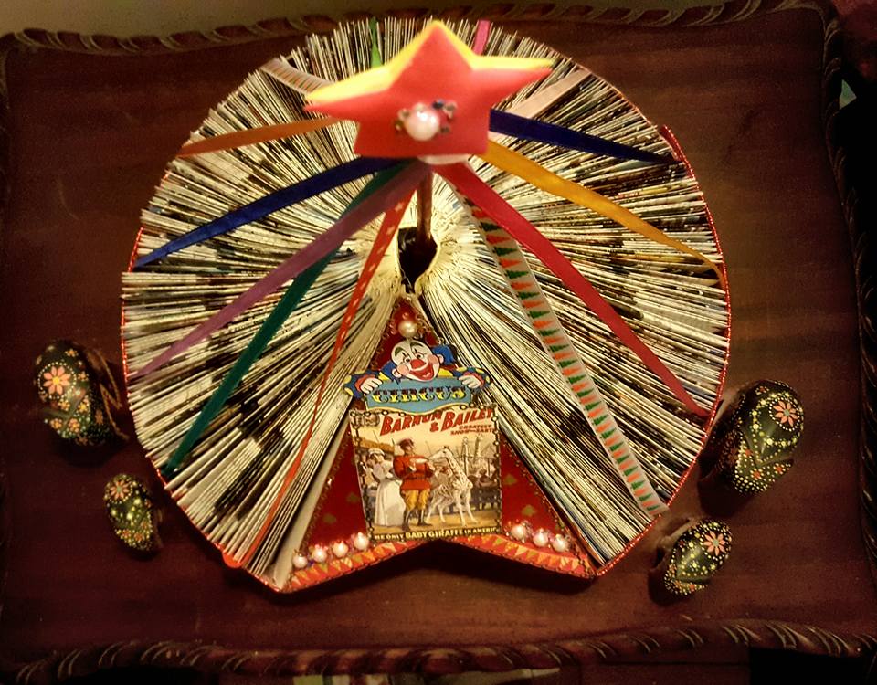 I created a big top for the circus. My friend gave me some small elephants when she moved house a number of years ago and I thought they fitted in very nicely with the circus theme. I managed to find a very thick book with lots of pages in order to create a 360 degree big top.